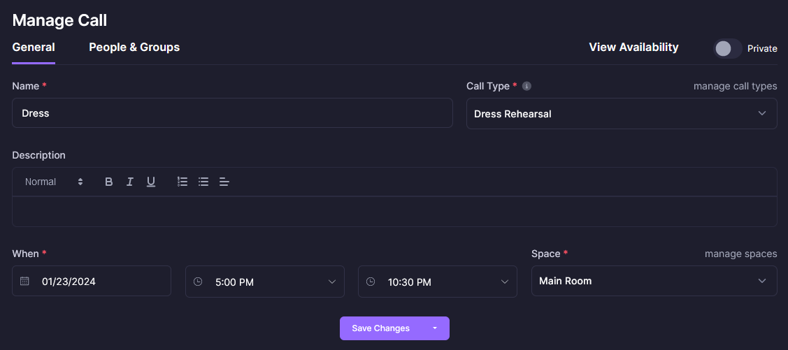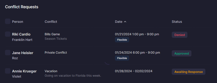 Cast & crew can submit personal conflicts, and you can easily see who's available for each rehearsal.
